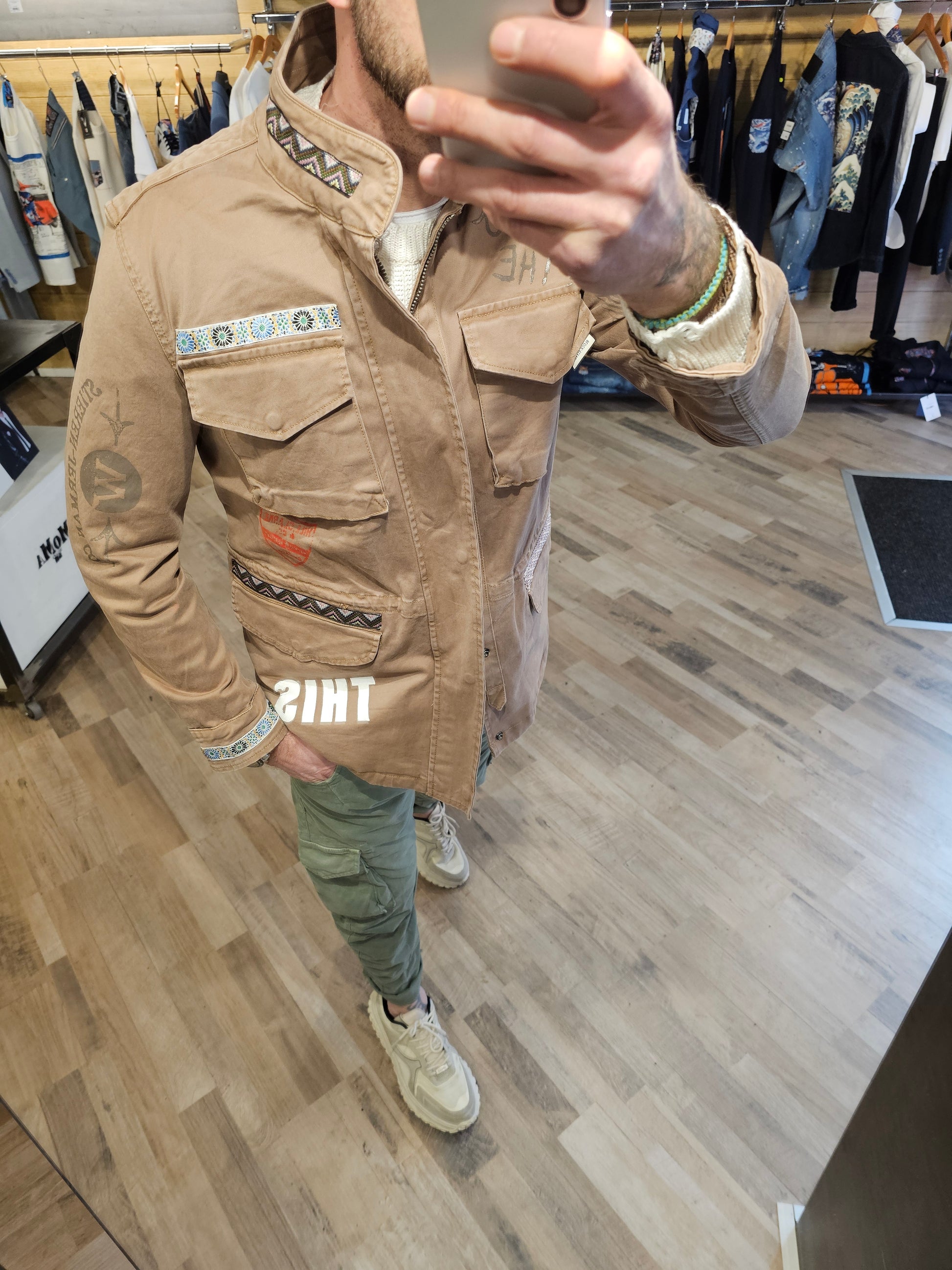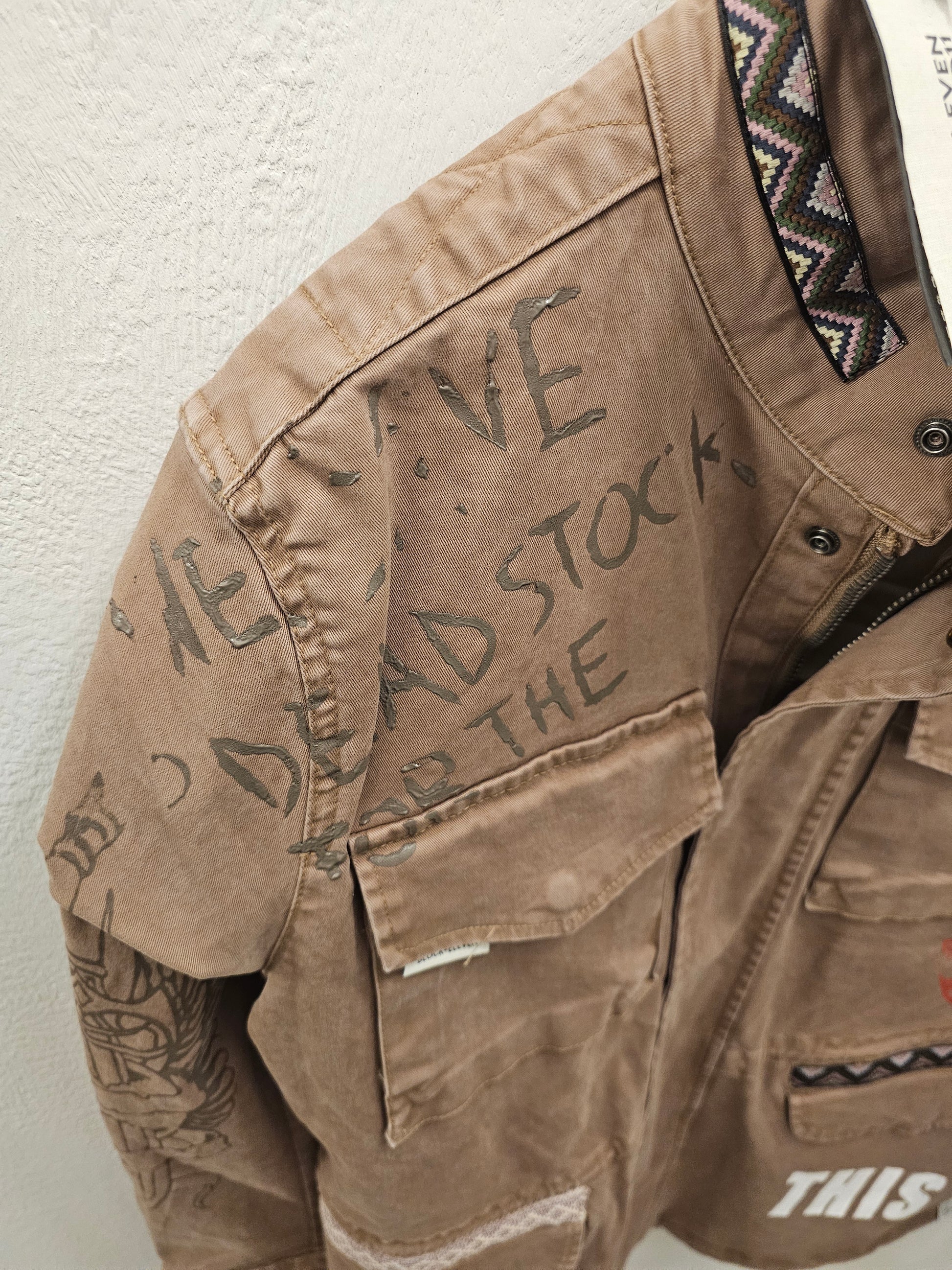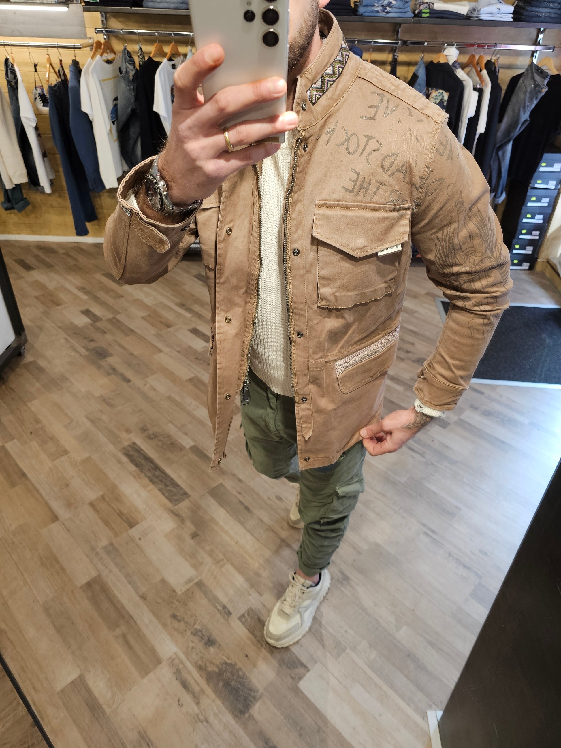 giubbino primaverile con doppia chiusura sia bottone che cerniera , dettagli ricamati su polsini collo e tasche , scritte in vernice anche sul retro , una giacca che non ti farà passare inosservato e che esprime stile e moda .