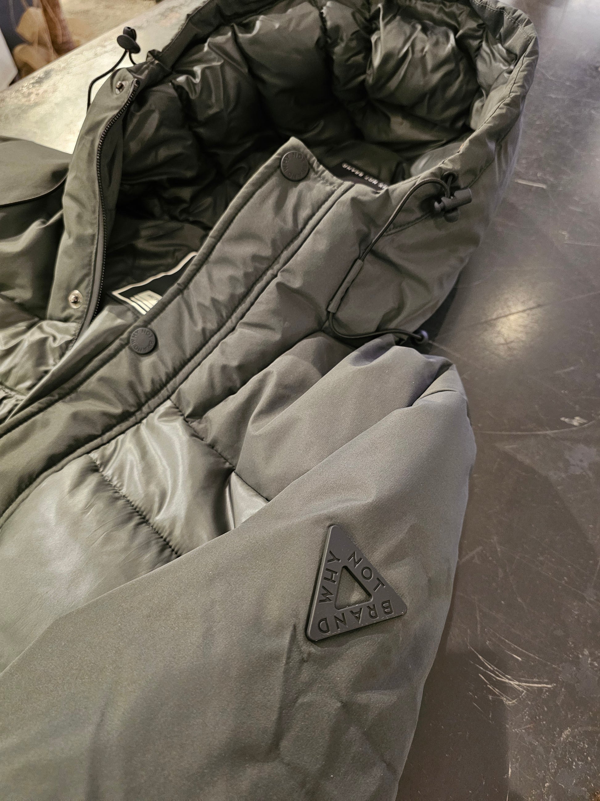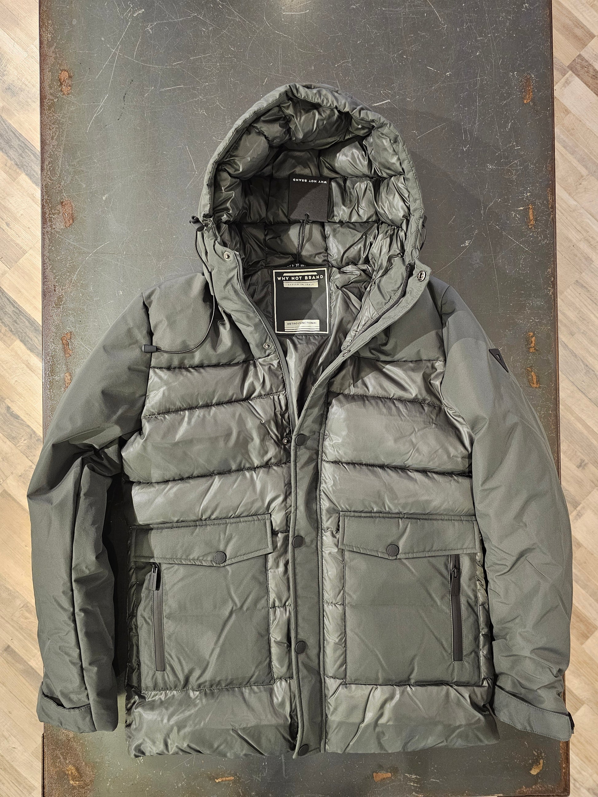 giubbino doppio tessuto tecnico+parte in piumino ecologico, cappuccio con regolazione, polsino antifreddo con regolazione a strappo ampiezza manica, cerniere in acciaio ricoperte in gomma, logo a rilievo su braccio destro. La lunghezza del giubbino è appena sotto la tasca del pantalone (lunghezza parka media), colore verde militare