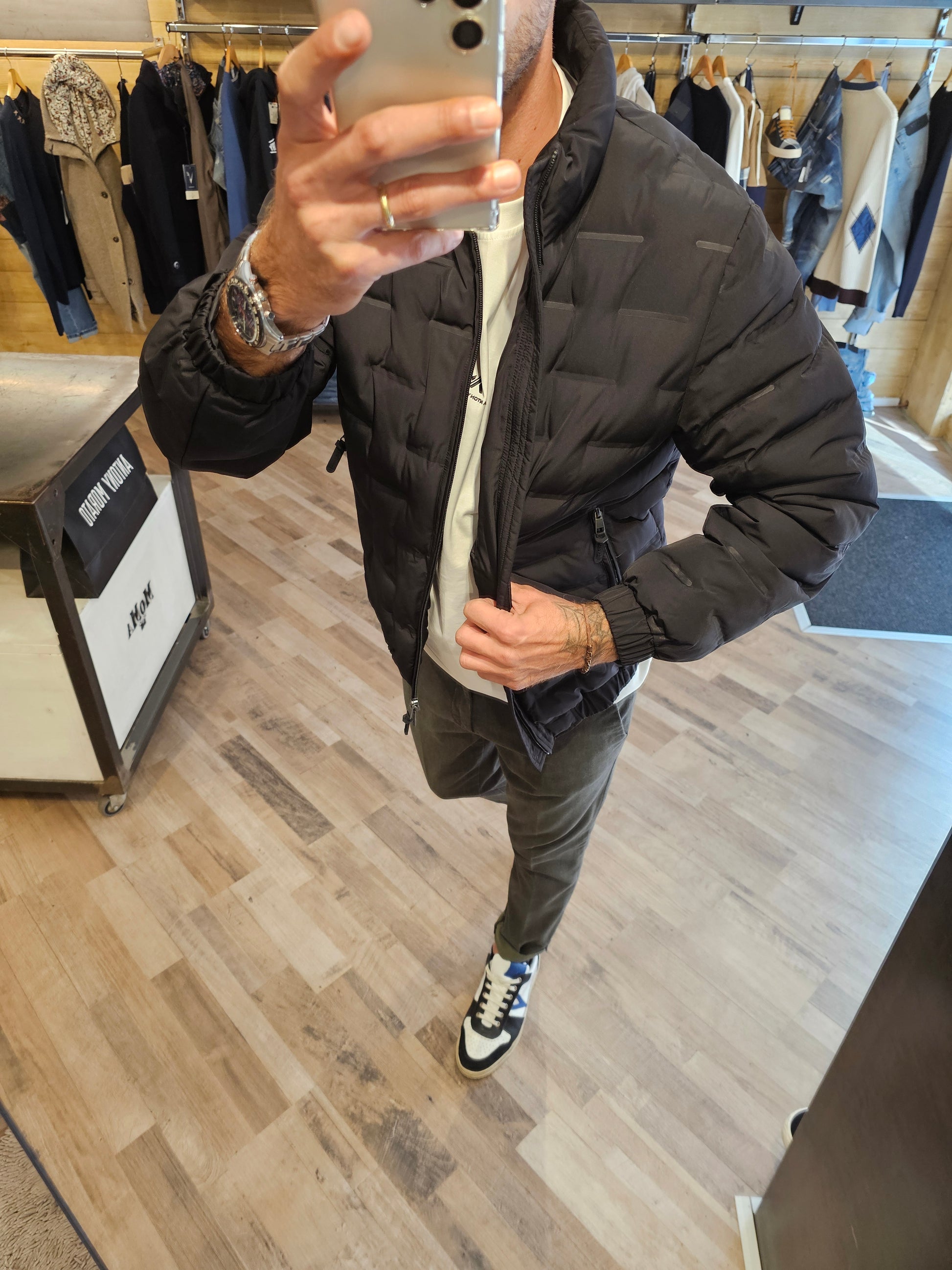 Questo giubbotto invernale nero, realizzato in eco piuma, combina stile audace e funzionalità. I dettagli termosaldati creano una trama unica e accattivante, mentre le cerniere in acciaio garantiscono resistenza e carattere. Gli elastici su polsi e vita assicurano una vestibilità aderente, proteggendoti dal freddo con un tocco deciso e moderno. Perfetto per chi vuole distinguersi anche nelle giornate più fredde.