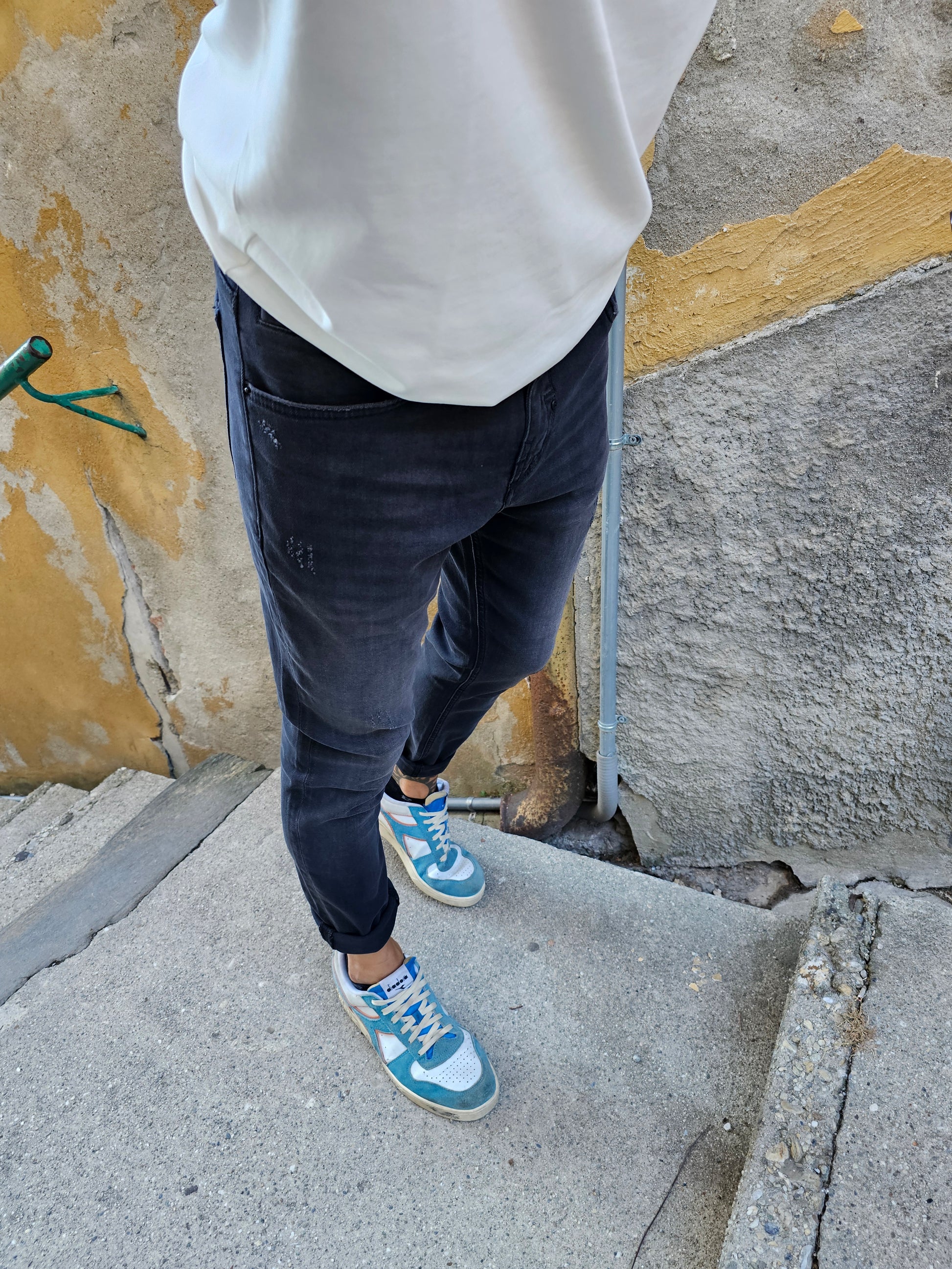 tessuto superflex , la particolarità di questo tessuto è la sua elasticità e memoria elastica che regala una comodità impareggiabile, nelle foto è stato risvoltato la sua lunghezza è alla scarpa, tipica vestibilità carrot fit con gamba zona superiore leggermente mobida per poi finire con fondo stretto. Particolare il nuovo logo sulla tasca posteriore destra in gomma e metallo rialzato. Colore nero sfumato