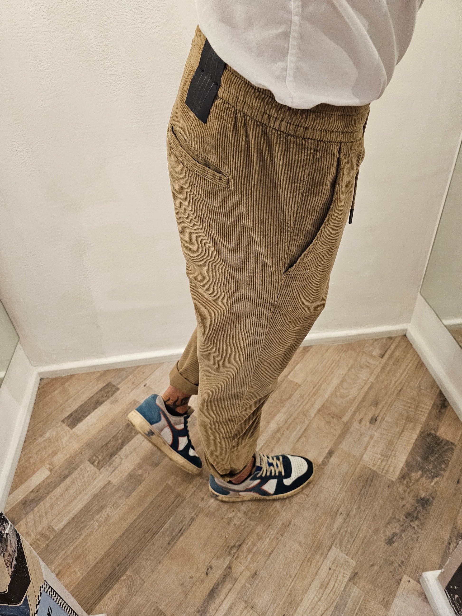 velluto a coste , colore cammello , vestibilità leggermente più morbida sulla coscia per poi scendere con fondo slim , nelle foto è stato risvoltato, laccetti in vita con elastico per una comodità ottimale
