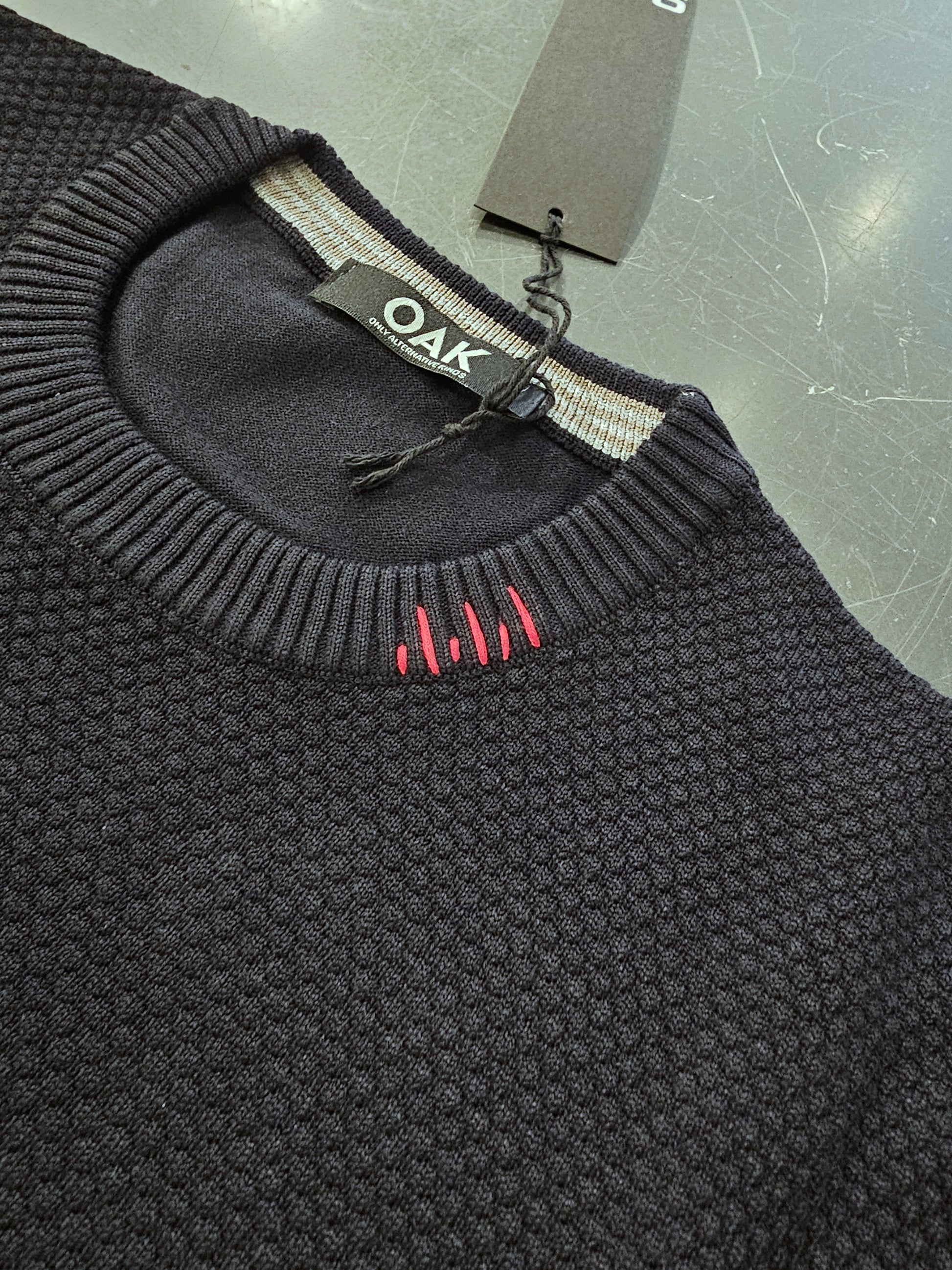 La maglia blu ricamata sfida la convenzione con toppe grigie a contrasto sui gomiti, il filo rosso ricamato sul collo cattura l’attenzione, mentre il tessuto centrale a trama in rilievo crea un effetto tattile distintivo, bilanciato dalle maniche e dal retro lisci per un design moderno e deciso. La vestibilità  è slim fit