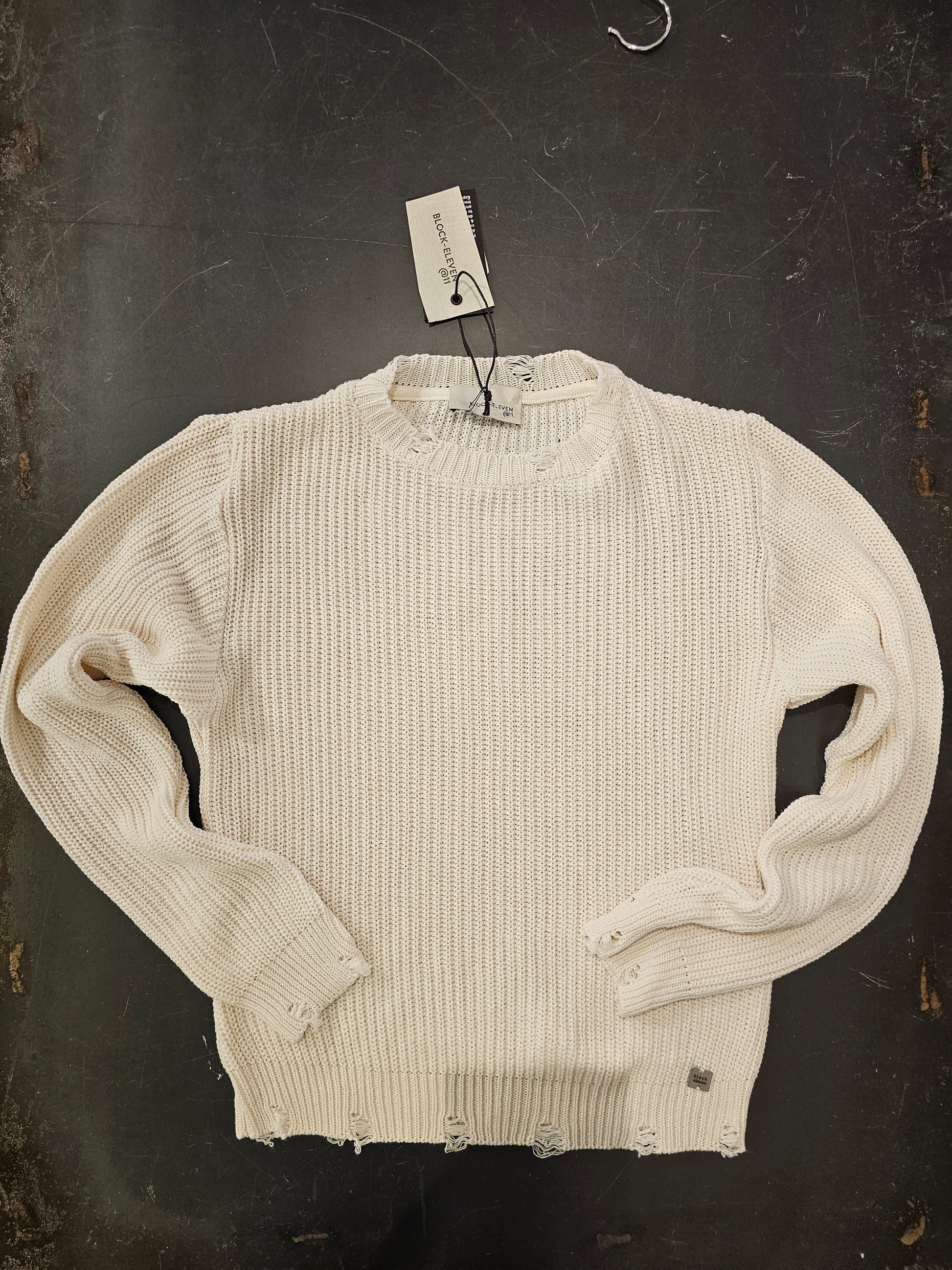 Maglia primaverile in cotone bianco a coste, dettagli rotture su collo maniche e fascia vita, particolare la targhetta metallica ricamata che aggiunge un tocco distintivo alla maglia