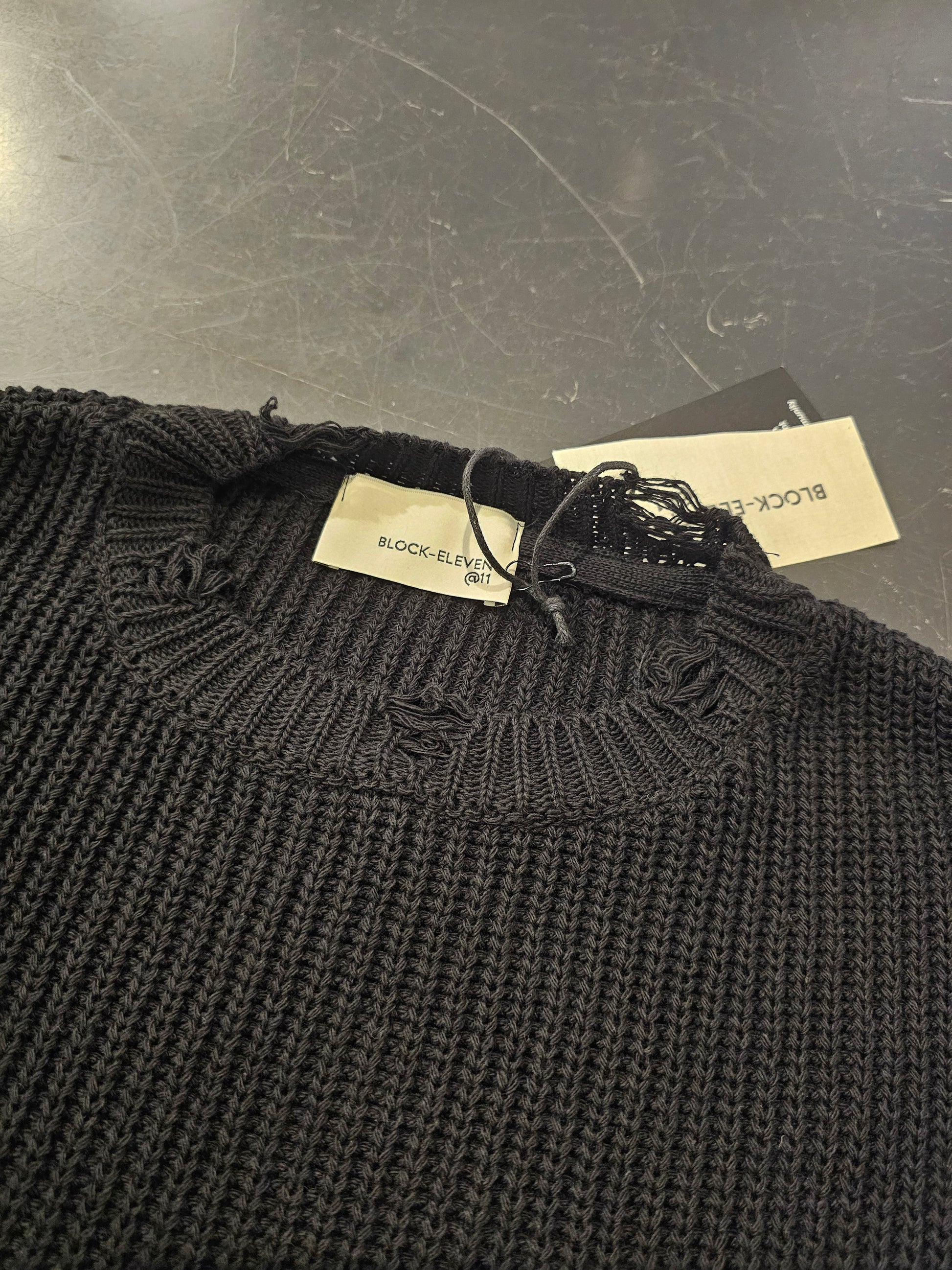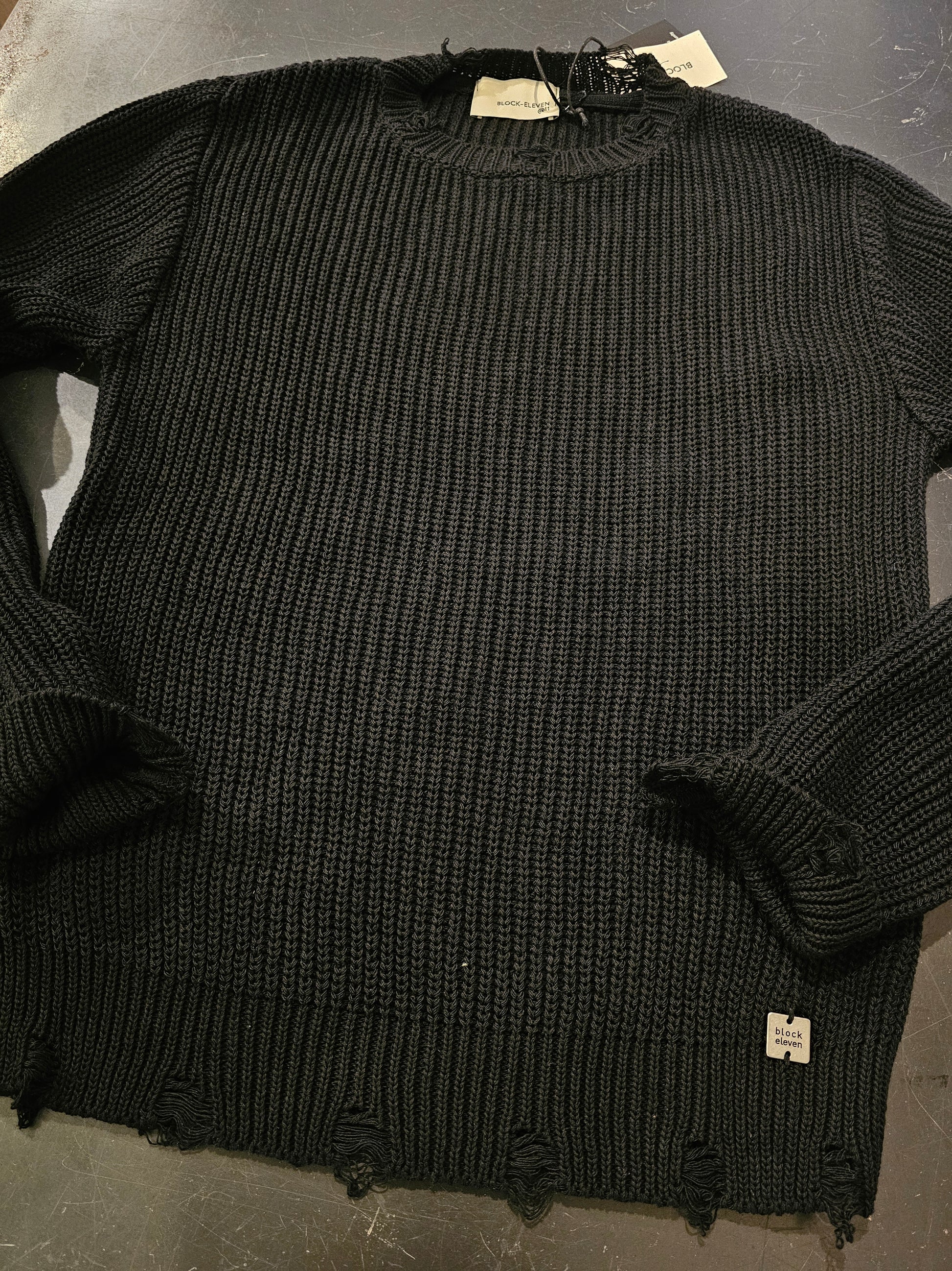 Maglia primaverile in cotone nero a coste, dettagli rotture su collo maniche e fascia vita, particolare la targhetta metallica ricamata che aggiunge un tocco distintivo alla maglia