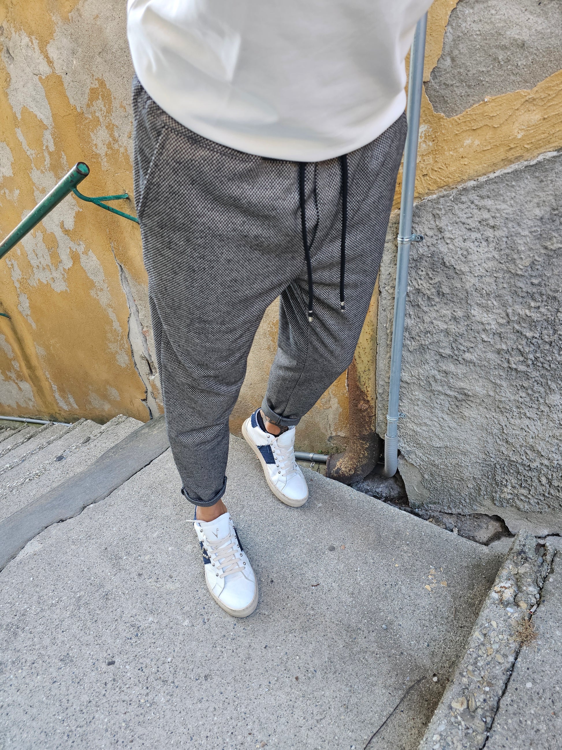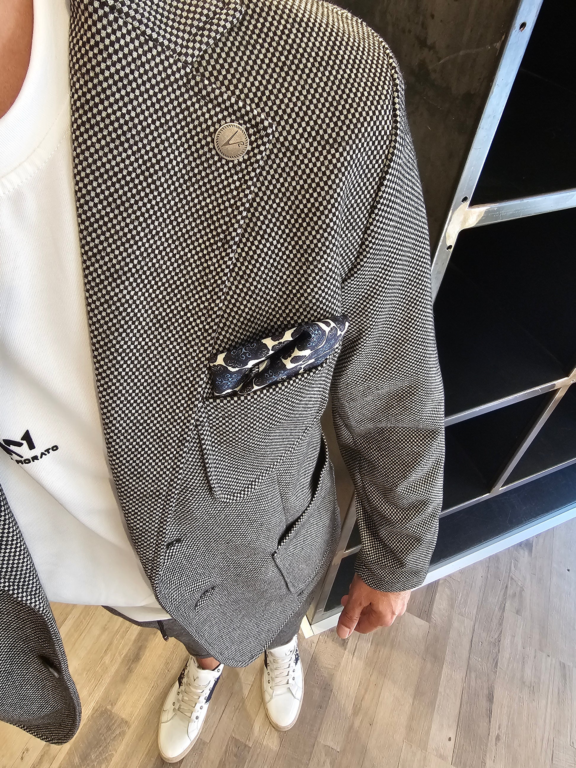 abito in tessuto superflex , la particolarità di questo tessuto in fantasia è proprio la sua elasticità che rende questo abito casual e super comodo, il pantalone con elastico in vita e laccetto a contrasto si adatta molto bene a tutte le corporature , idem la giacca che oltre alla comodità si distingue per dettagli come il fazzoletto removibile a contrasto e l'interno giacca uguale al fazzoletto oltre ad avere una spilla in metallo con logo che aggiunge un ulteriore tocco di stile.