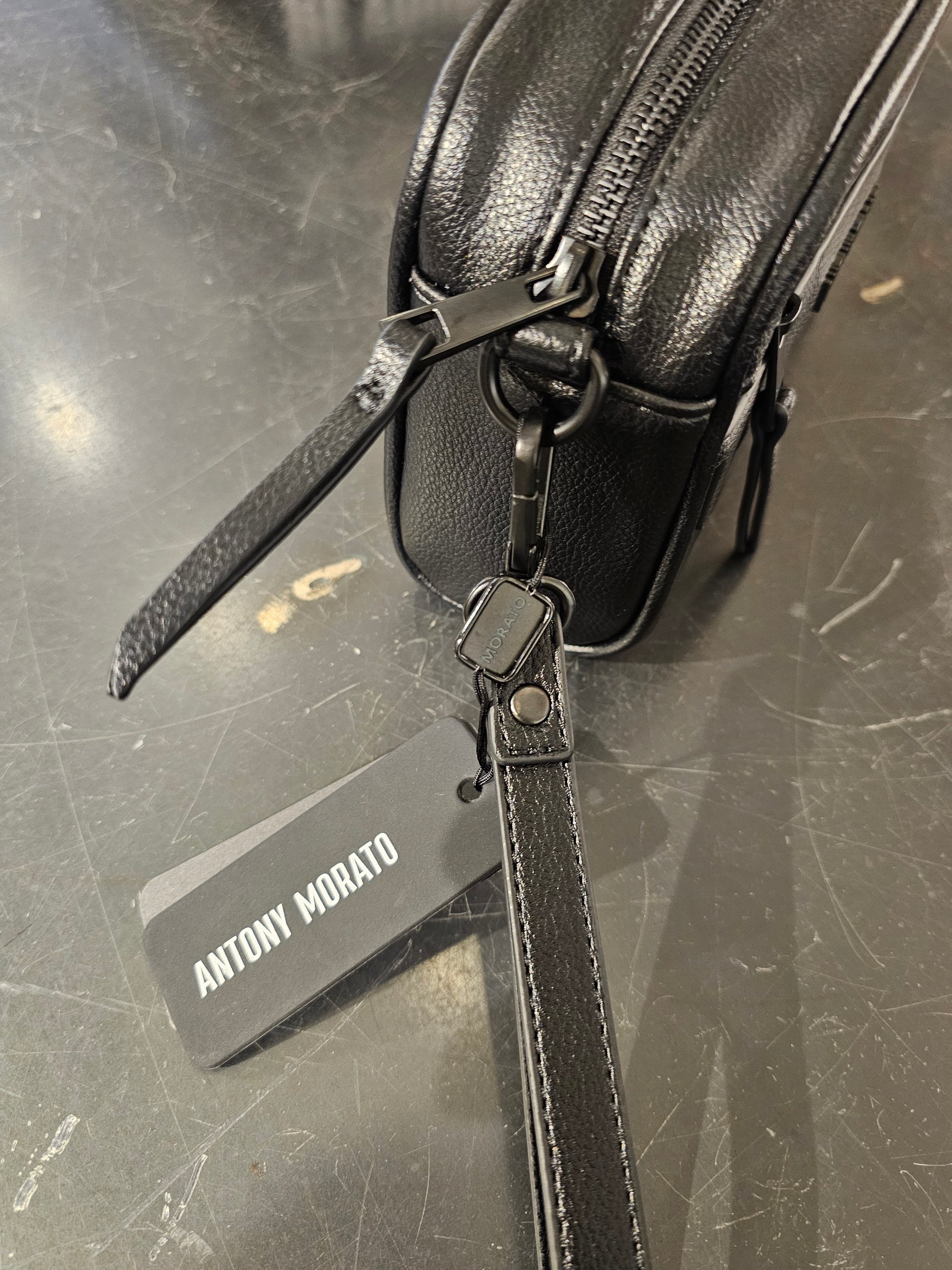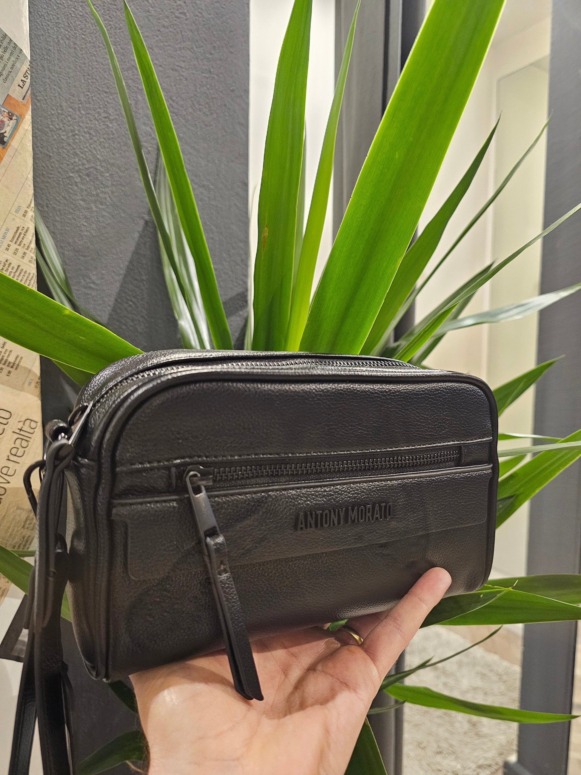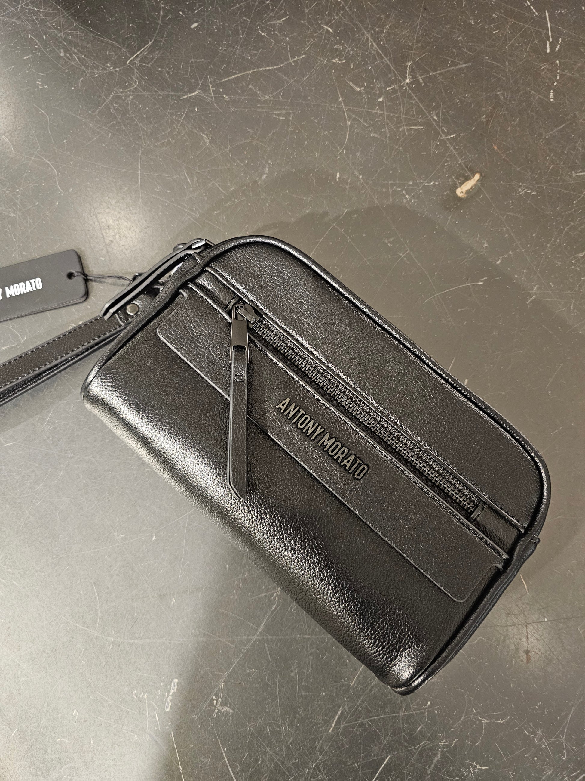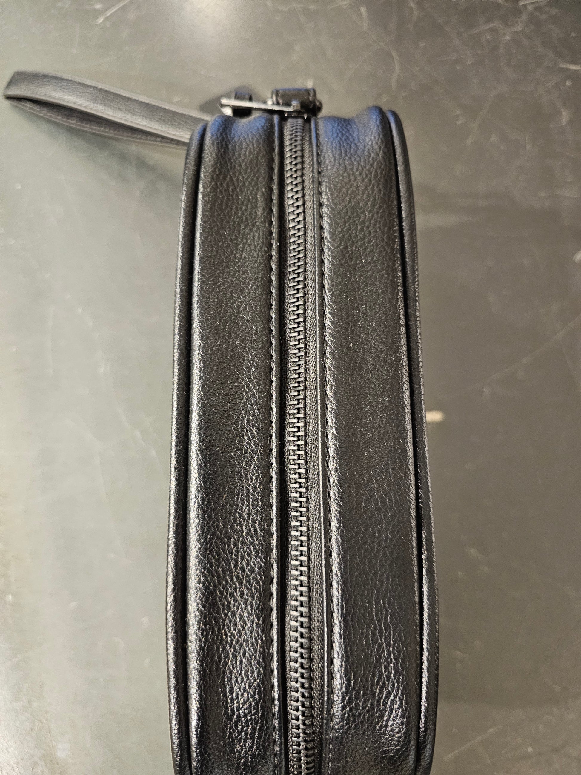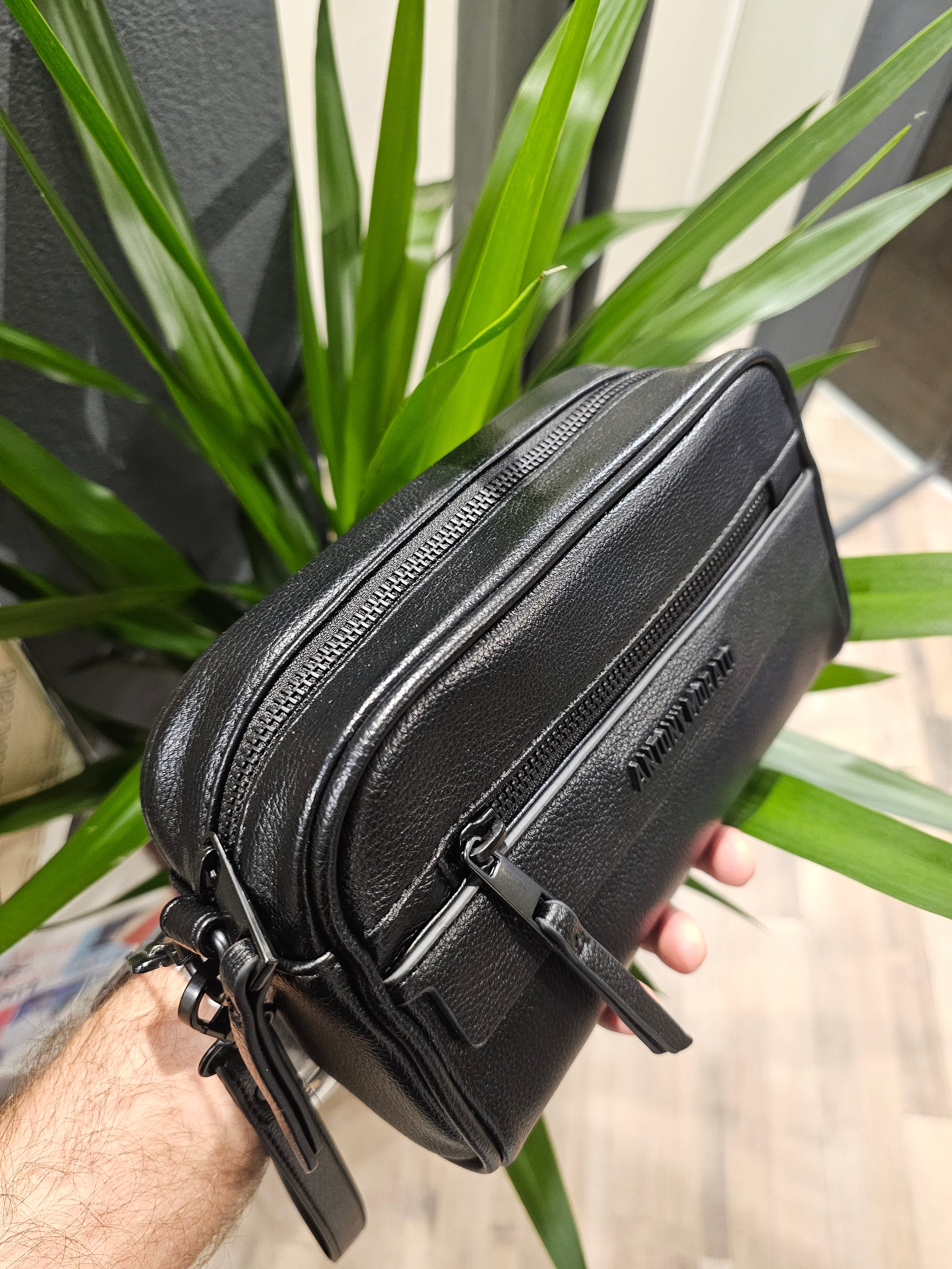 borsello da uomo , materiale ecopelle con logo in acciaio rialzato, molto capiente , doppio scomparto, cerniere metallo , tracolla per portarlo al polso