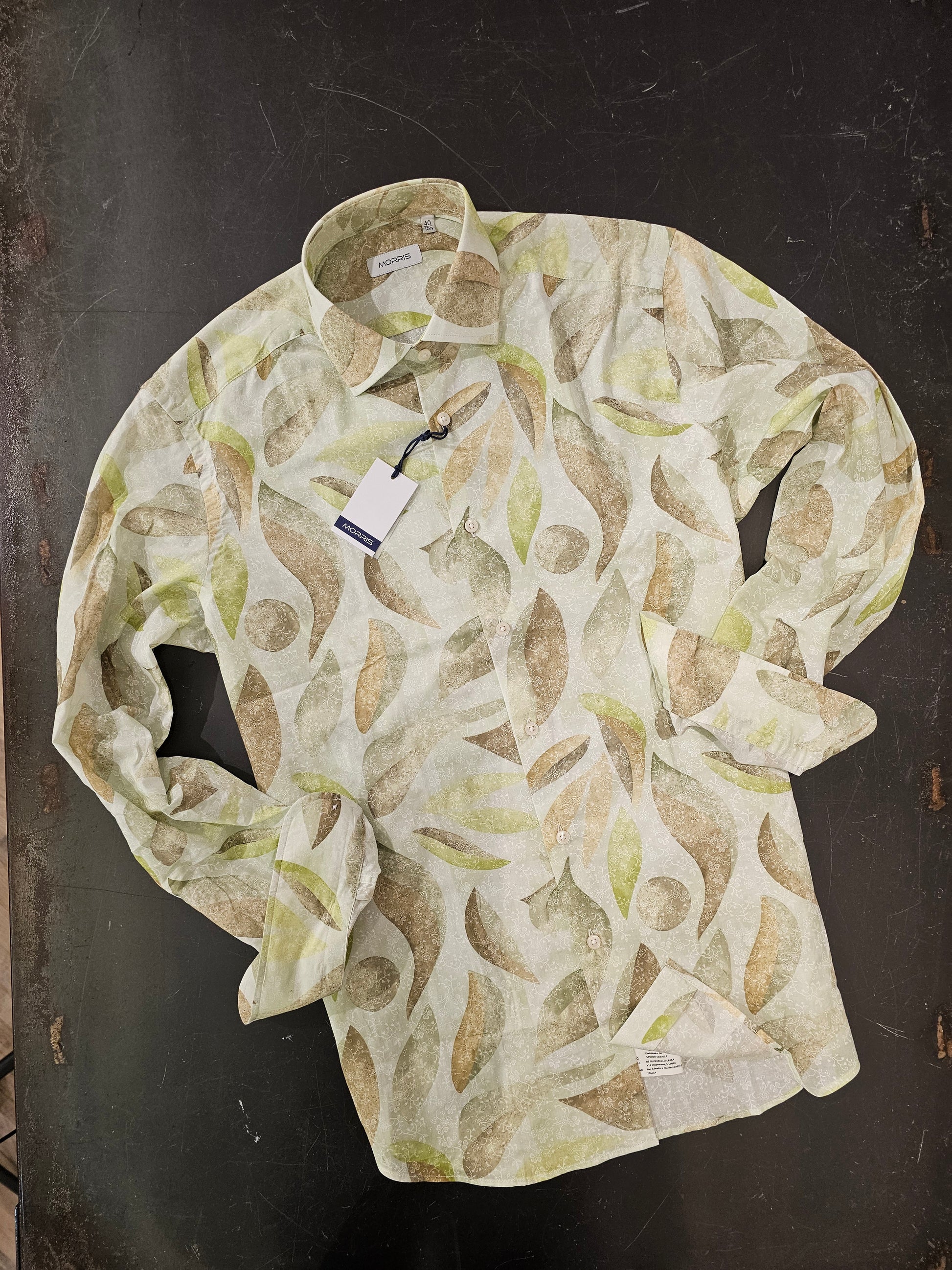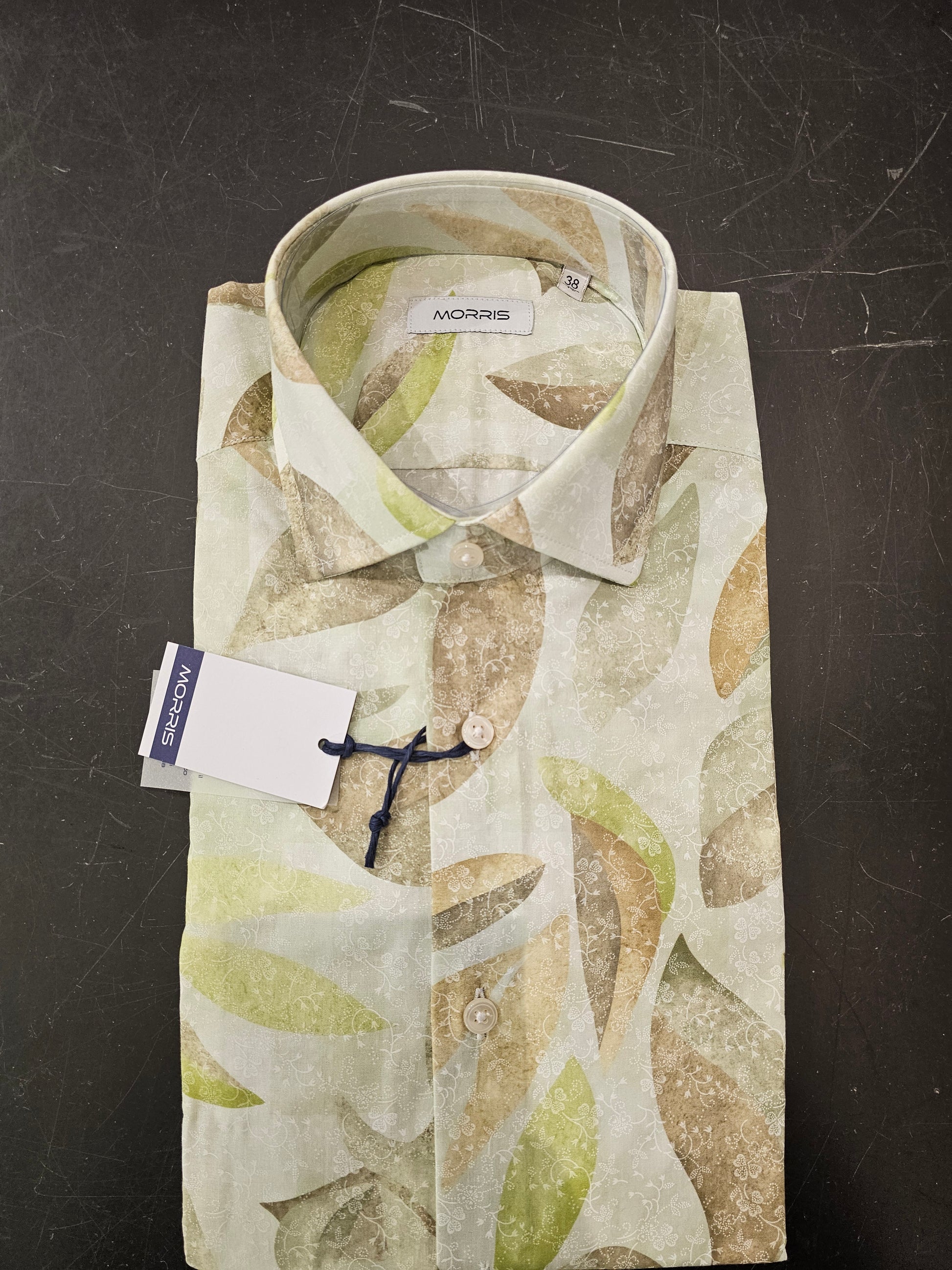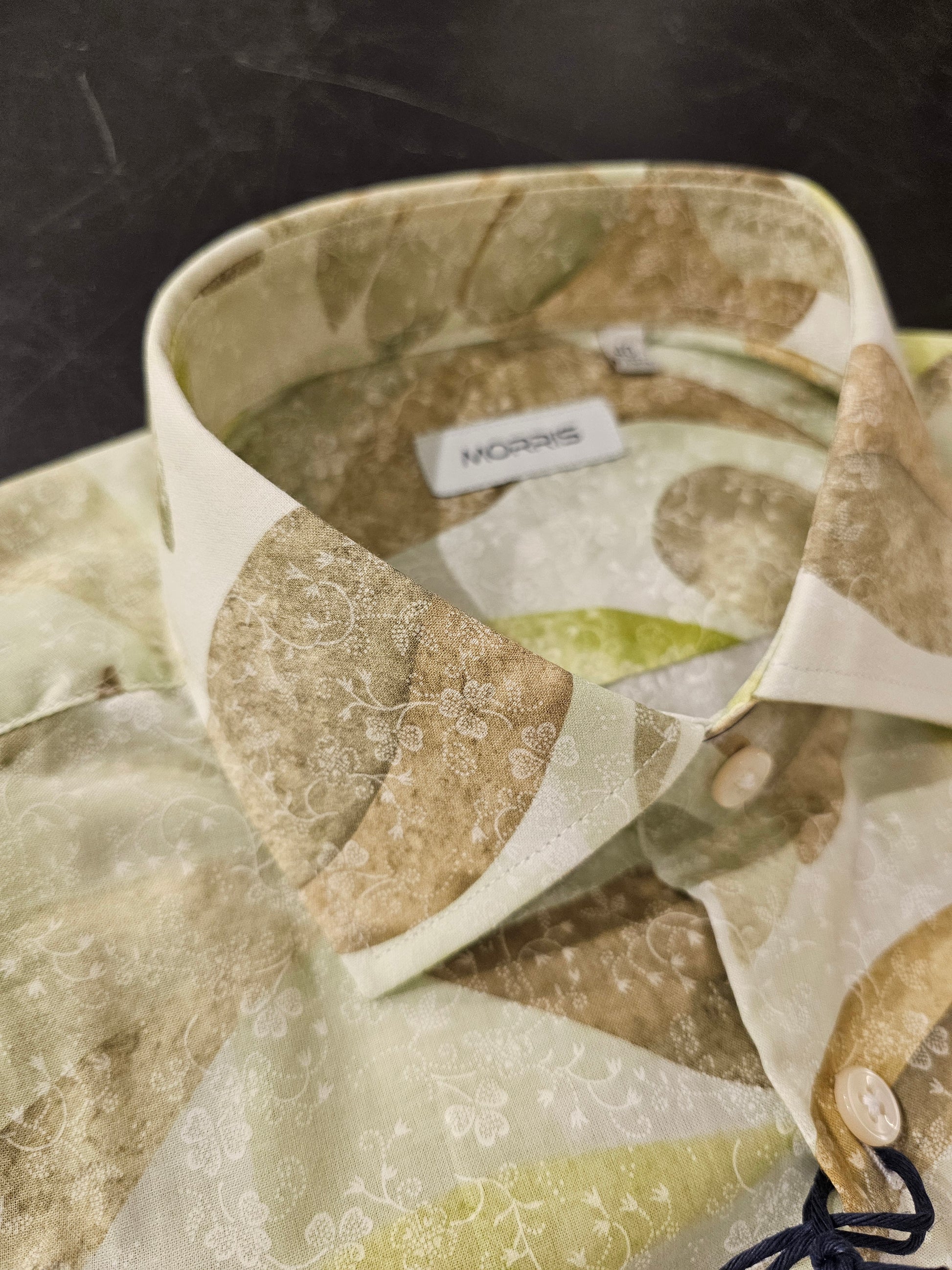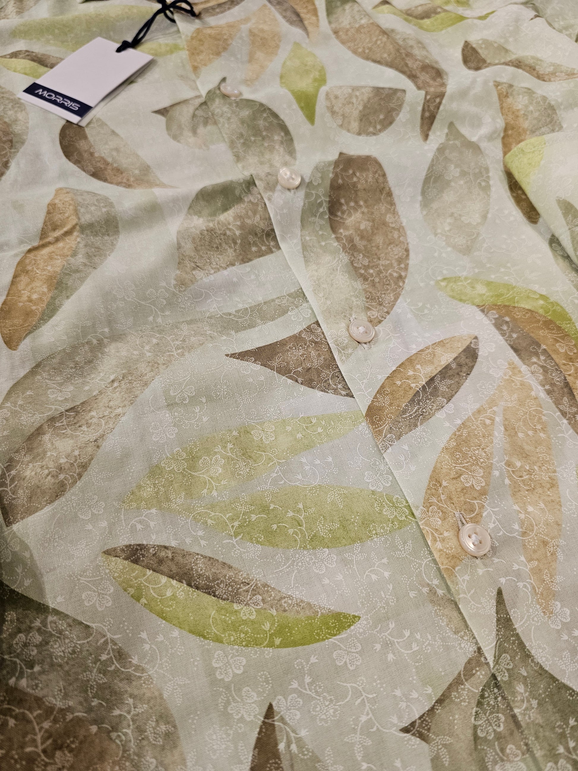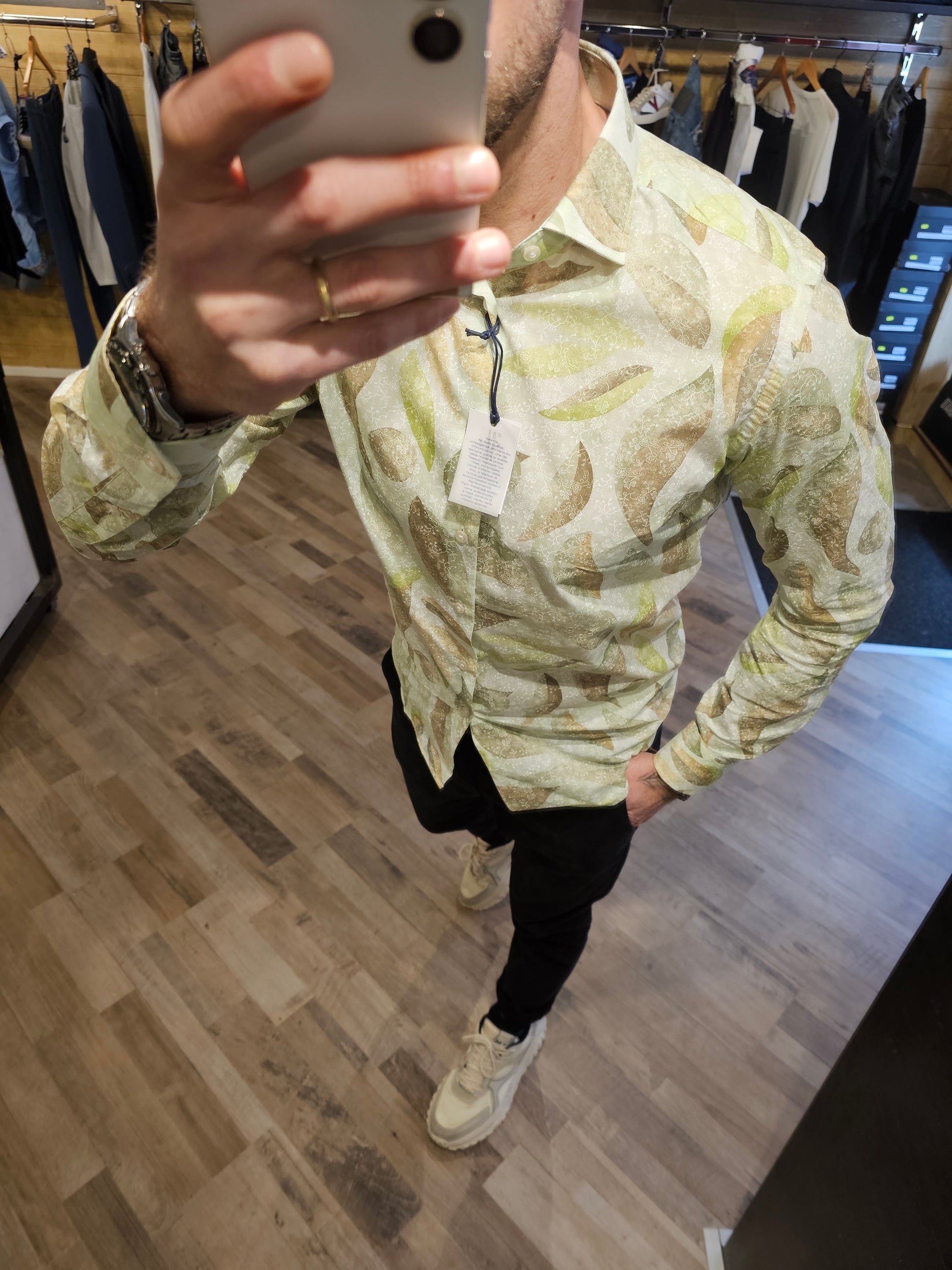 Tessuto cotone elasticizzato con fantasia foglie e un particolare ricamo a contrasto bianco presente su tutta la camicia , vestibilità è slim fit , una camicia che esprime personalità e che si adatta sia ad un look elegante ma anche indossata su un jeans