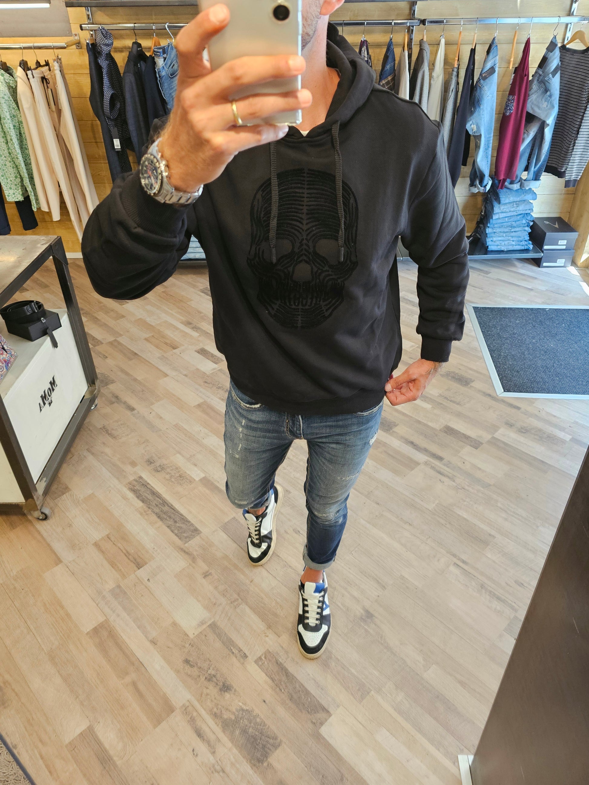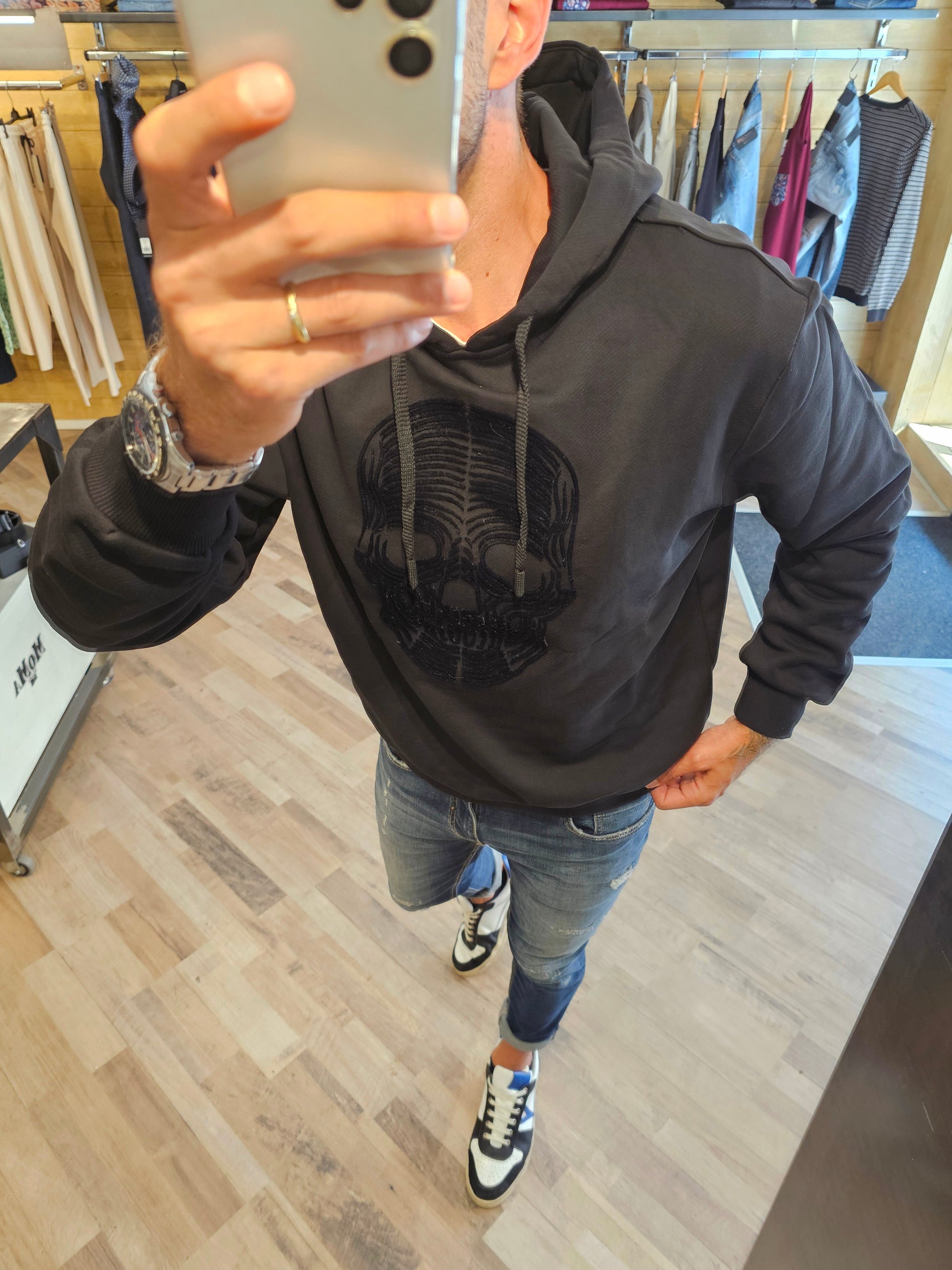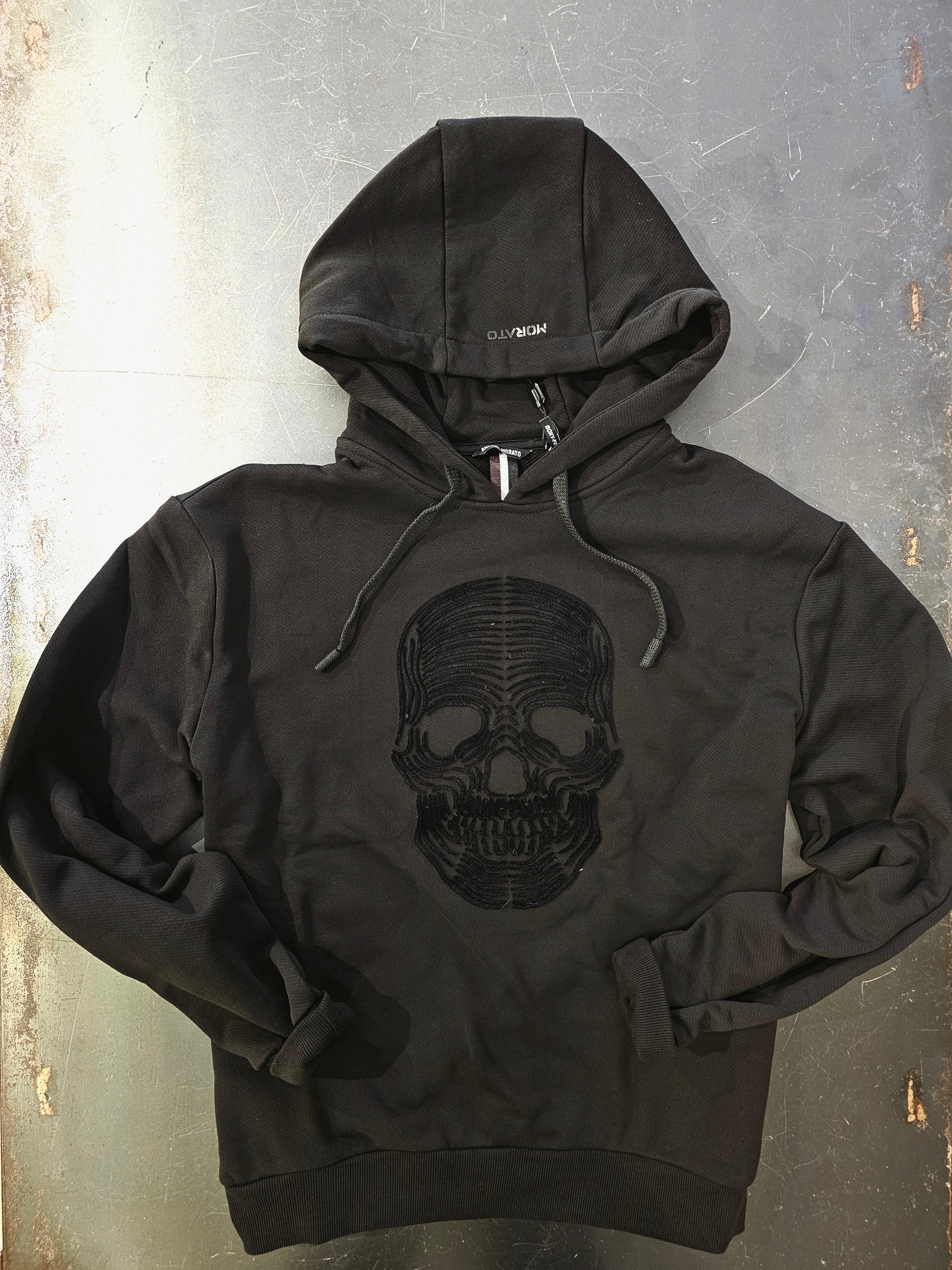 Questa felpa nera con cappuccio presenta un teschio in rilievo che aggiunge un tocco audace e distintivo al tuo look. La vestibilità regular garantisce comfort e libertà di movimento, rendendola perfetta per un uso quotidiano senza rinunciare allo stile. Ideale per chi cerca un capo versatile e grintoso da indossare in ogni occasione.