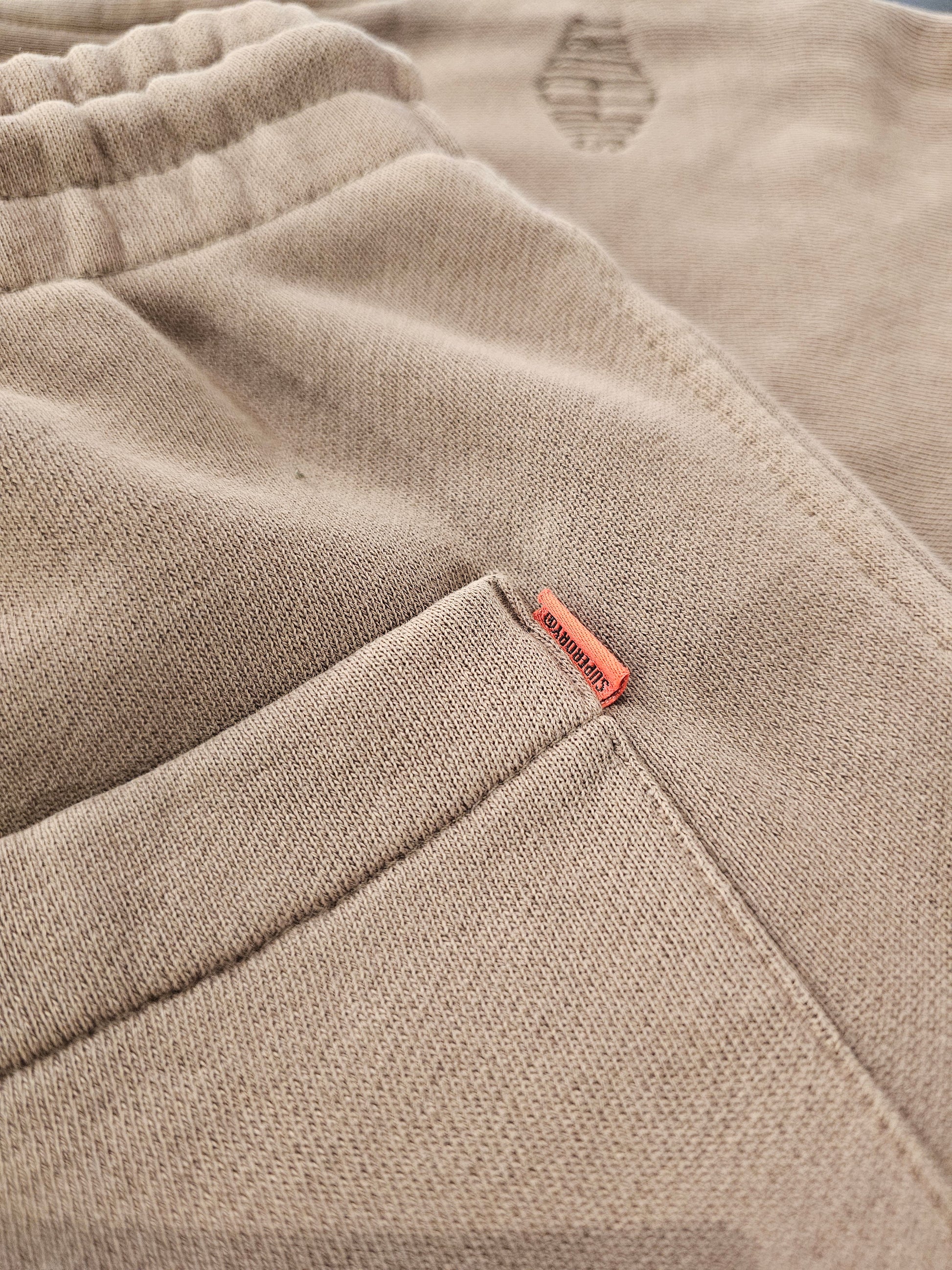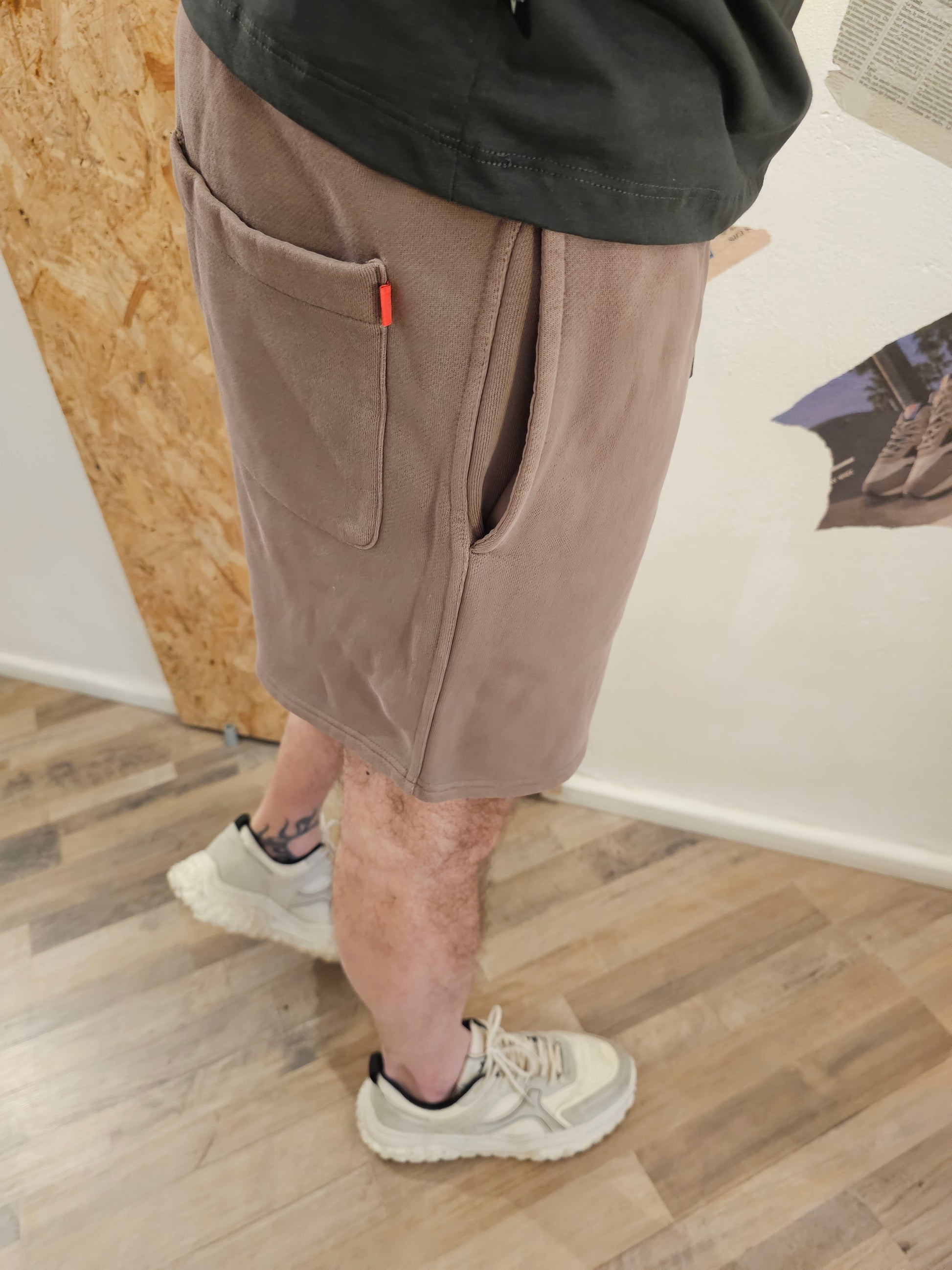 colore sabbia , super comodo grazie al suo elastico in vita con laccetti , tasche anteriori taglio dritto + tasca portafogli posteriore, dettaglio logo ricamato a lato