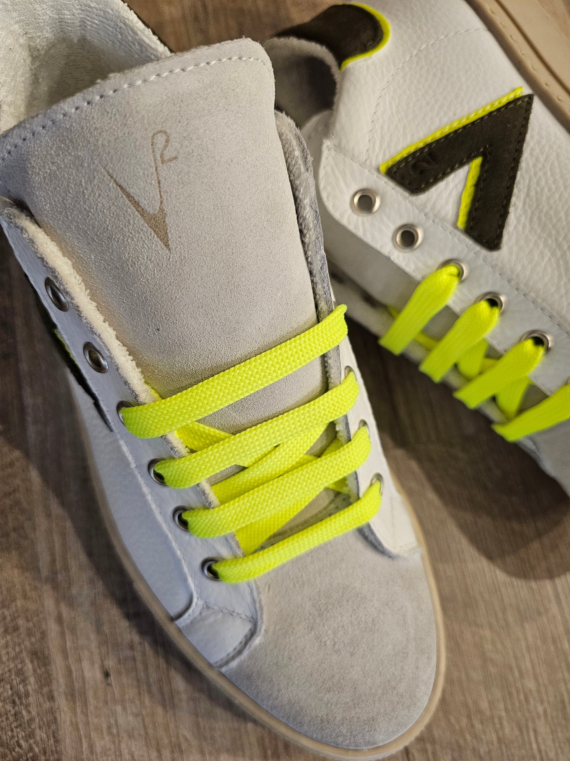 realizzate in vera pelle con dettagli in scamosciato verde militare e beige , lacci e contrasti giallo fluo , suola leggera ed interno soft touch per garantire comodità